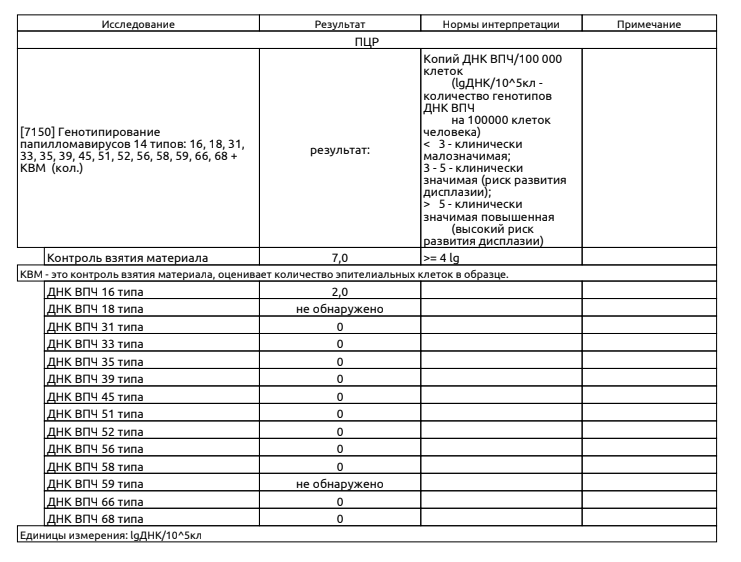 Качественное определение ДНК ВПЧ показывает наличие или отсутствие вышеуказанных типов ВПЧ, но не даст ответа о их количестве в случае обнаружения вирусов.