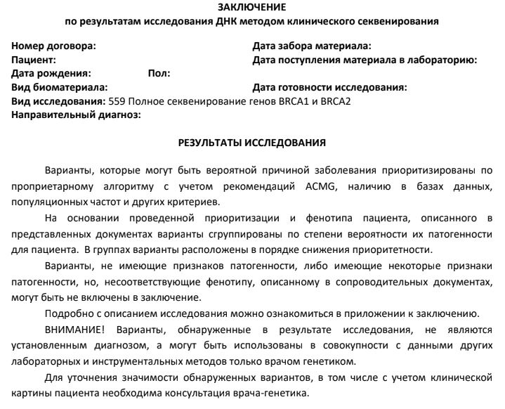 Мутации в генах BRCA1 или BRCA2 связаны с повышенным риском развития рака молочной железы. Пожизненный риск развития рака молочной железы составляет 40-80% у женщин с патогенным вариантом BRCA1 или BRCA2. Риск рака яичников составляет 11-40 % и ниже для других видов рака. Хотя на наследственный рак молочной железы приходится небольшое количество всех случаев рака молочной железы (менее 5%), на него приходится большая доля рака молочной железы у молодых женщин и у женщин с тройным негативным раком молочной железы. Если в результате исследования выявлены мутации в генах BRCA1 или BRCA2, то следует пройти генетическое консультирование. Впоследствии можно рекомендовать генетическое консультирование и таргетное тестирование другим членам семьи. Гены BRCA1 и BRCA2 не являются строго специфичными для РМЖ. Патологический генотип BRCA1/2 по­вышает риск возникновения рака яичников, желудка, толстой кишки, эндометрия, поджелудочной железы, мочевого пузыря, опухолей головы и шеи, желчевыводящих путей, а также возникновения меланомы. Людям из группы высокого риска с мутацией, предрасполагающей к раку, следует предложить генетическое консультирование для обсуждения наблюдения и возможностей снижения риска рака молочной железы.